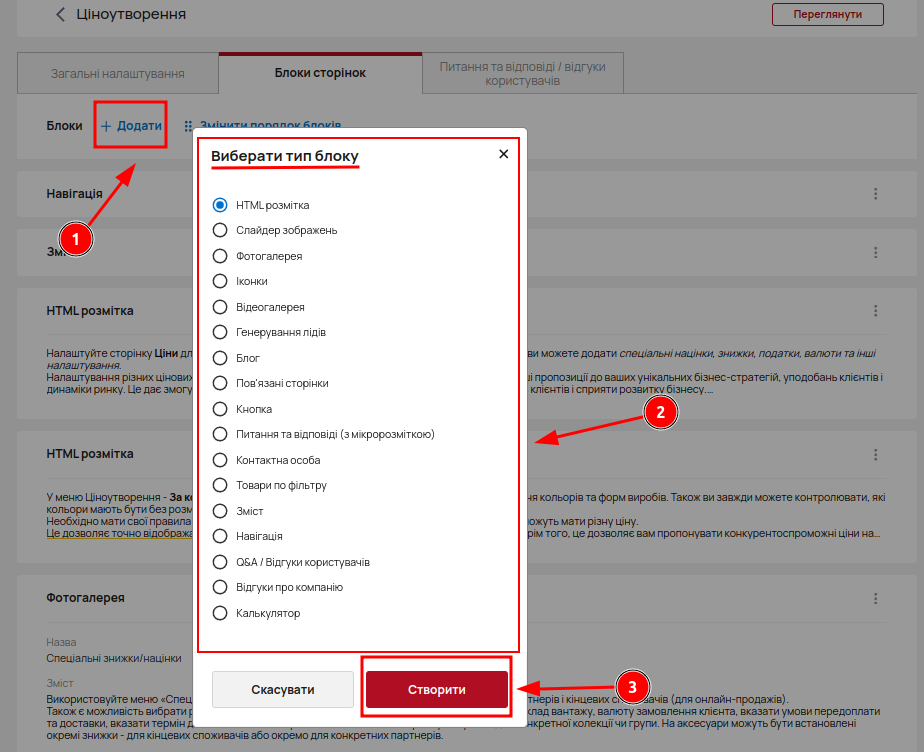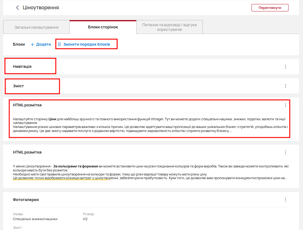 Блоки сторінок забезпечують візуальне оформлення сторінки. Ви можете спочатку створити відповідний список блоків, заповнити їх, а потім змінити порядок.