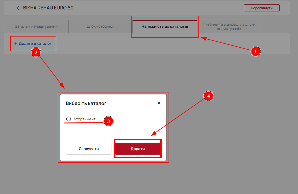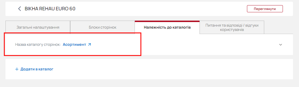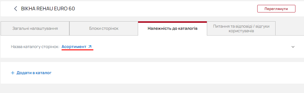 Натисніть на блок "Належніть до катологів" , далі натисніть "Додати в каталог" , оберіть один з доступних каталогів, натисніть "Додати".