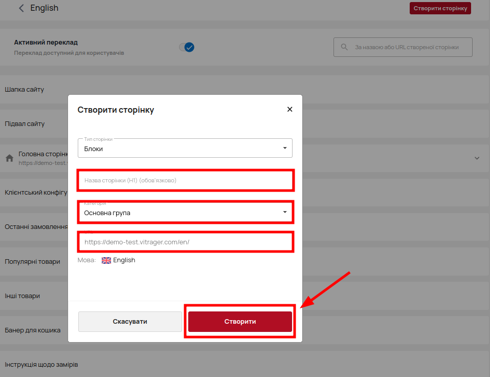 Введіть назву сторінки, виберіть категорію сторінки та введіть URL-адресу, по якій буде доступна сторінка(адреса може містити довільний текст, але тільки латинецею). Натисніть Створити.