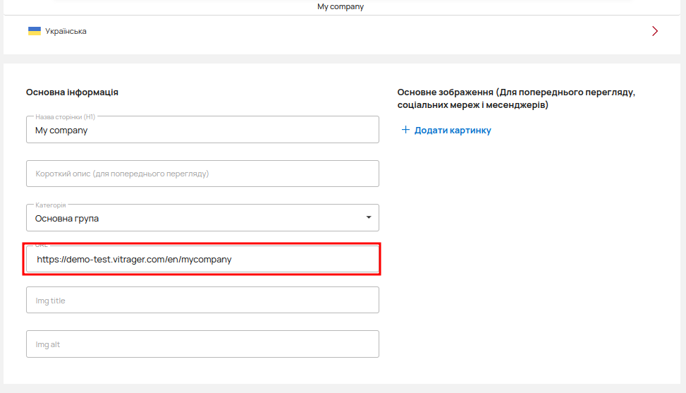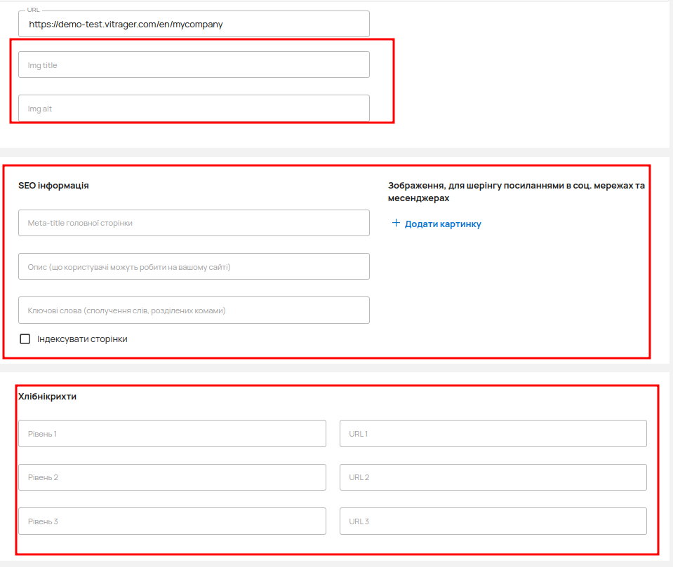 Додайте основне зображення (Для попереднього перегляду, соціальних мереж і месенджерів), заголовок зображення, alt зображення, інформацію про SEO та "хлібнікрихти".