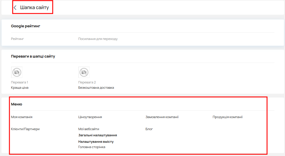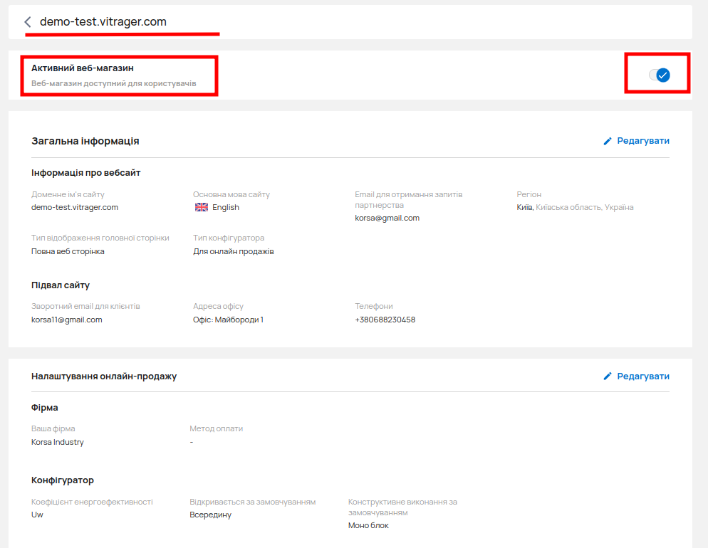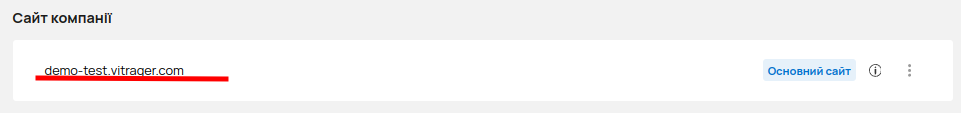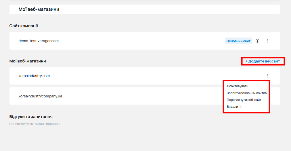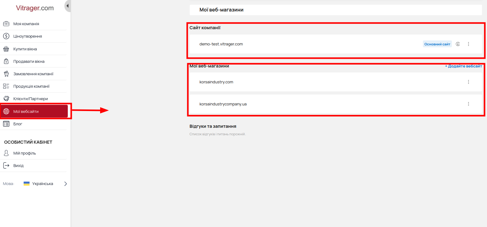 Пункт меню «Мої вебстайти» дозволяє вам використовувати веб-сайт компанії на субдомені Vitrager.com або створити веб-сайт на іншому домені.