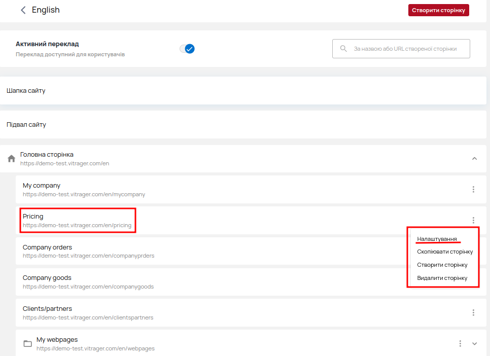 Ви також можете перейти в меню налашутвань створенного каталогу просто натиснувши на назву каталогу сторінок.