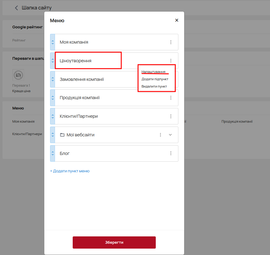 Тут ви можете побачити раніше додані елементи. Виберіть елемент, який потрібно зв’язати з нашою новоствореною сторінкою. Натисніть Налаштування.